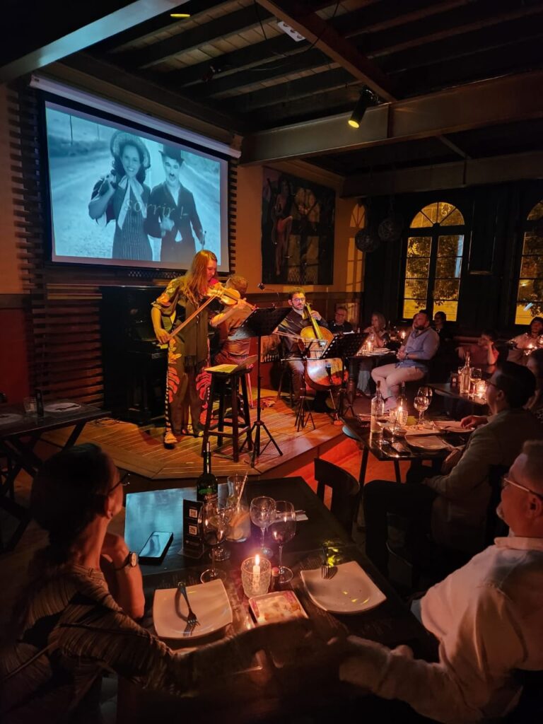 Trio de violino, cello e piano, interpretando músicas de cinema com projeção das cenas em telão.